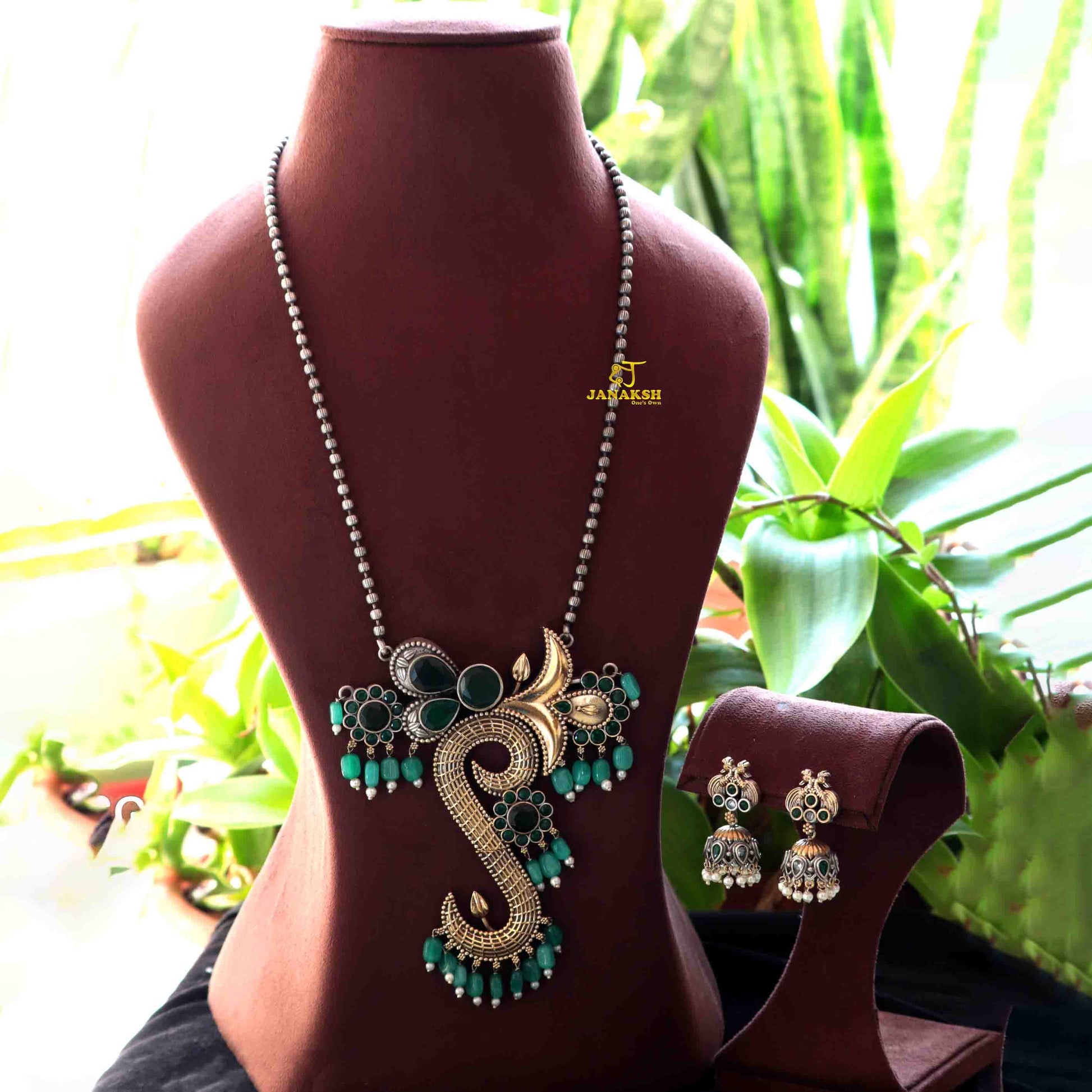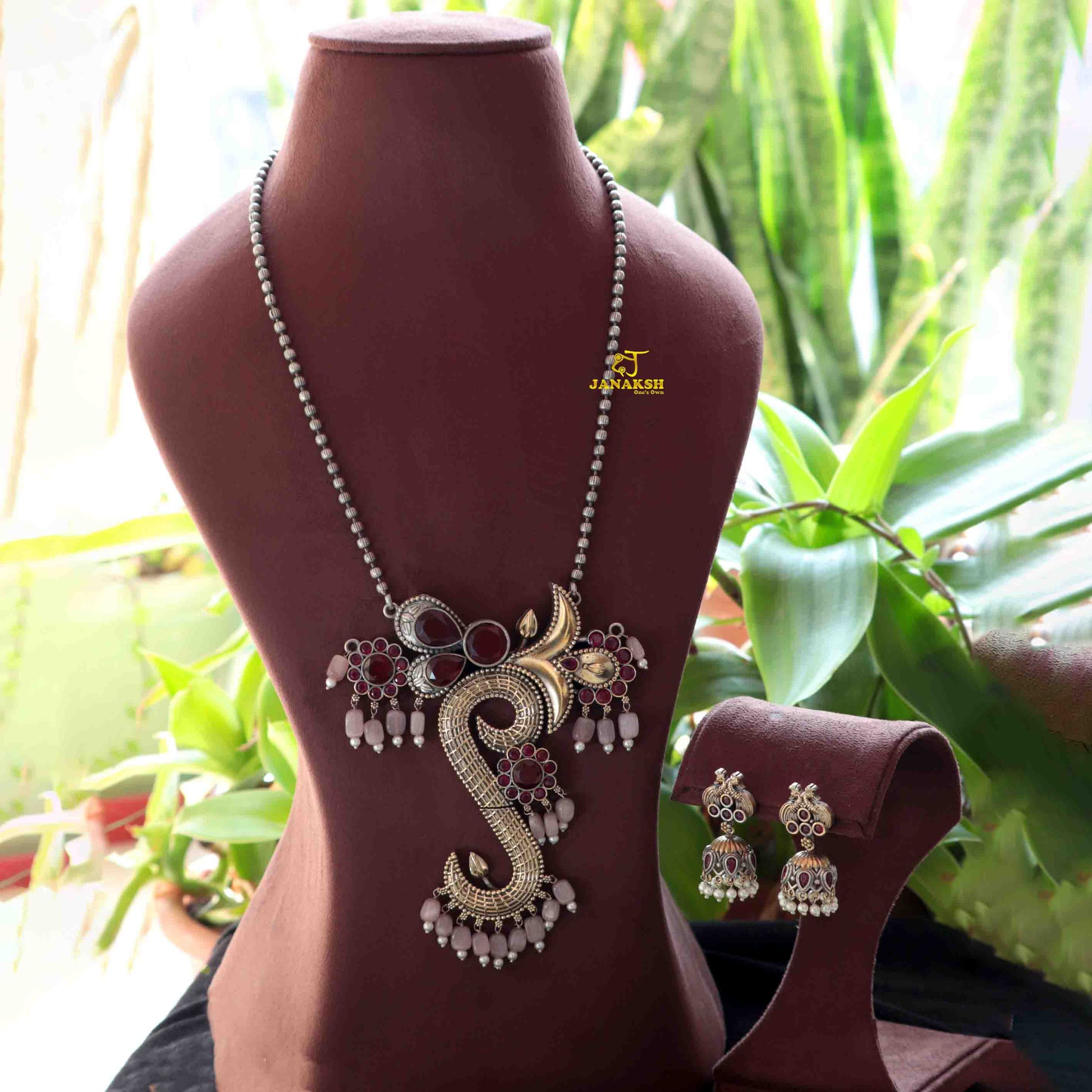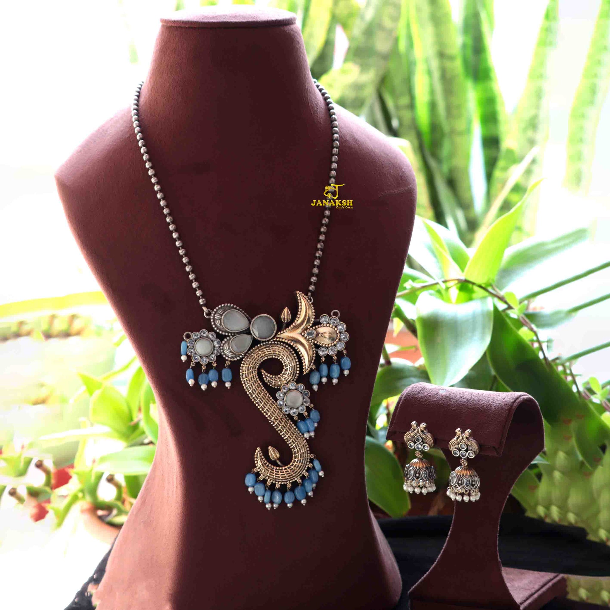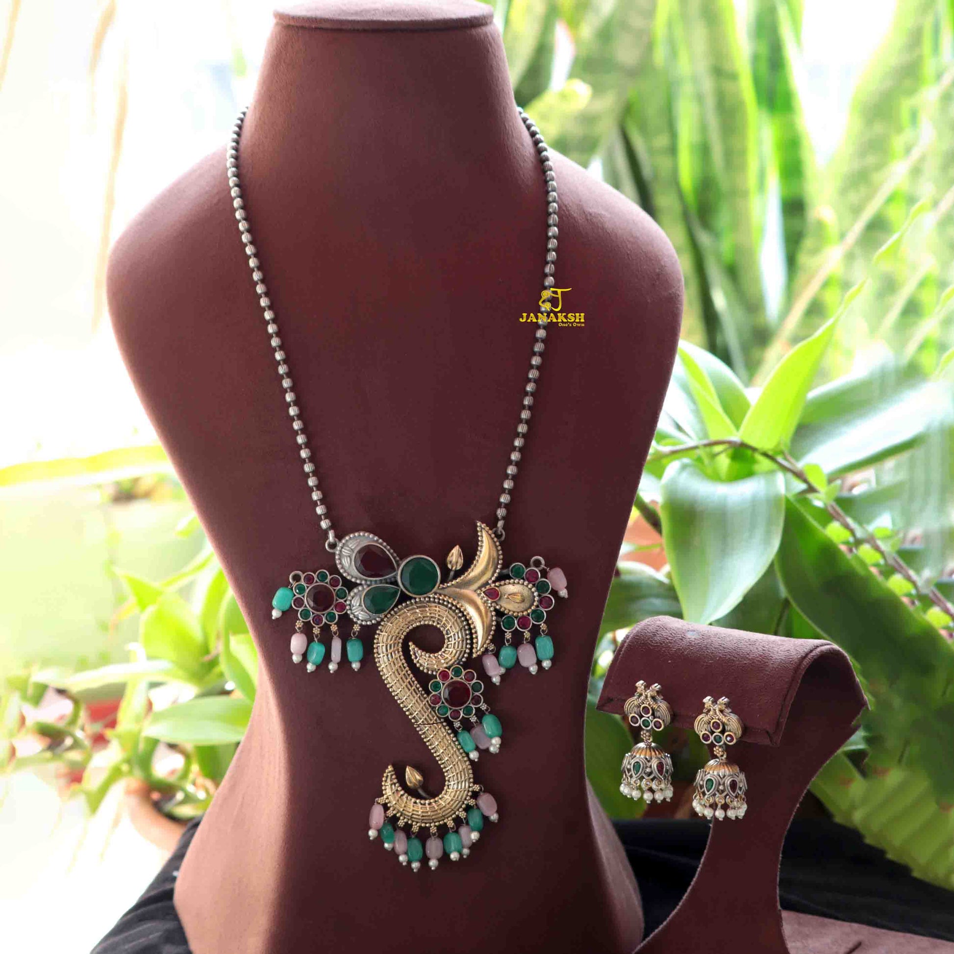 Elevate your style with our exquisite dual-tone pendant, a masterpiece adorned with Monalisa stones and intricate Lorel work. Each Monalisa tumble adds a touch of mystery and allure, perfectly complemented by an oxidized silver polish chain. Embrace timeless elegance with this captivating piece that seamlessly blends tradition with modern charm.
