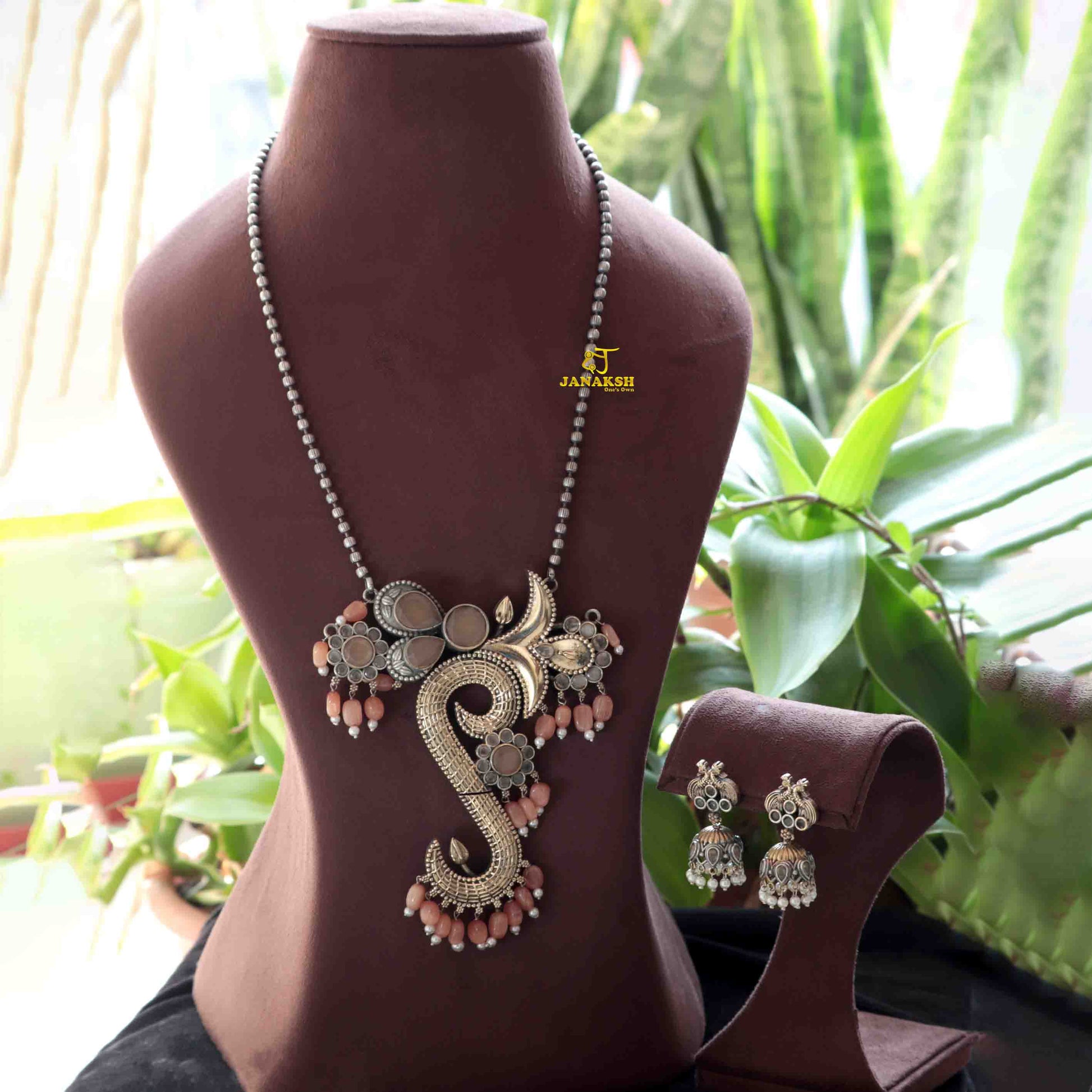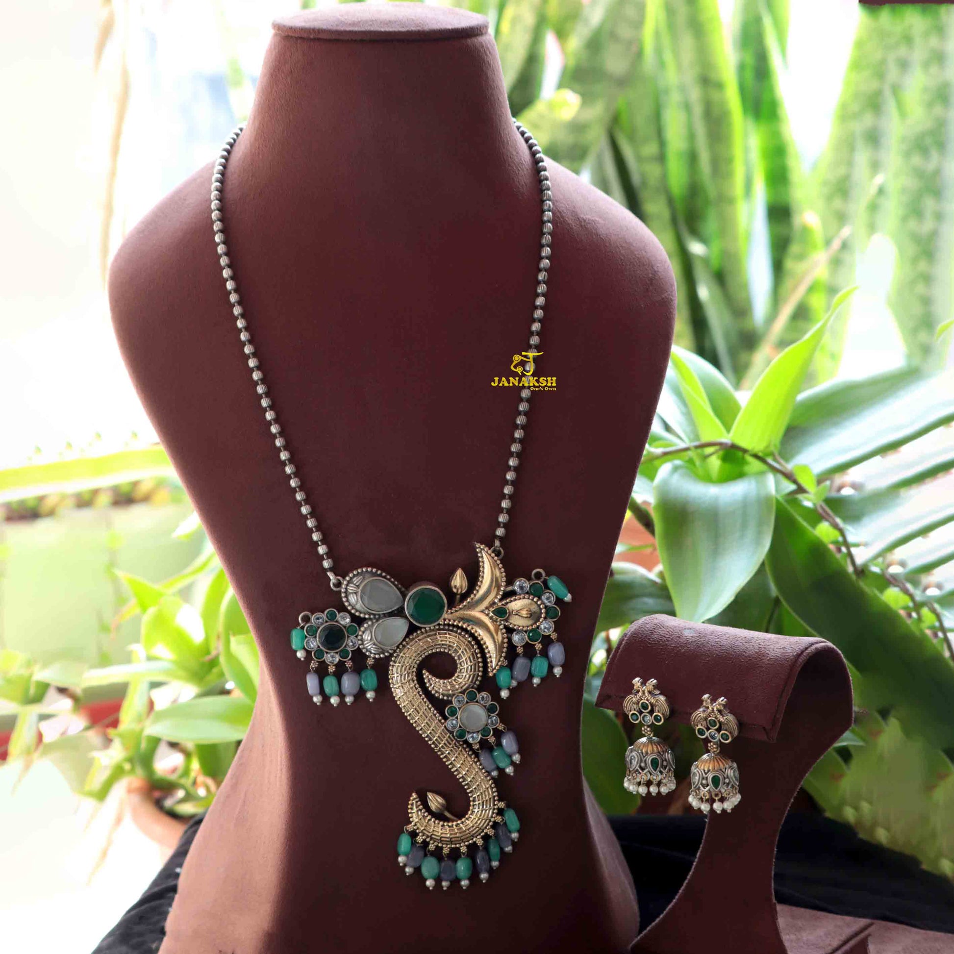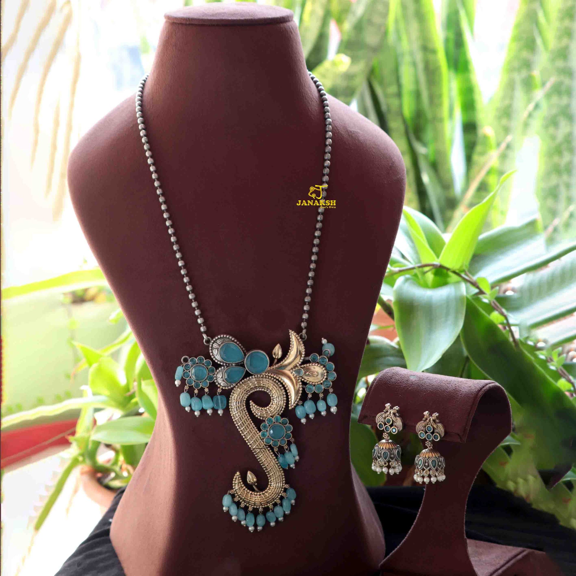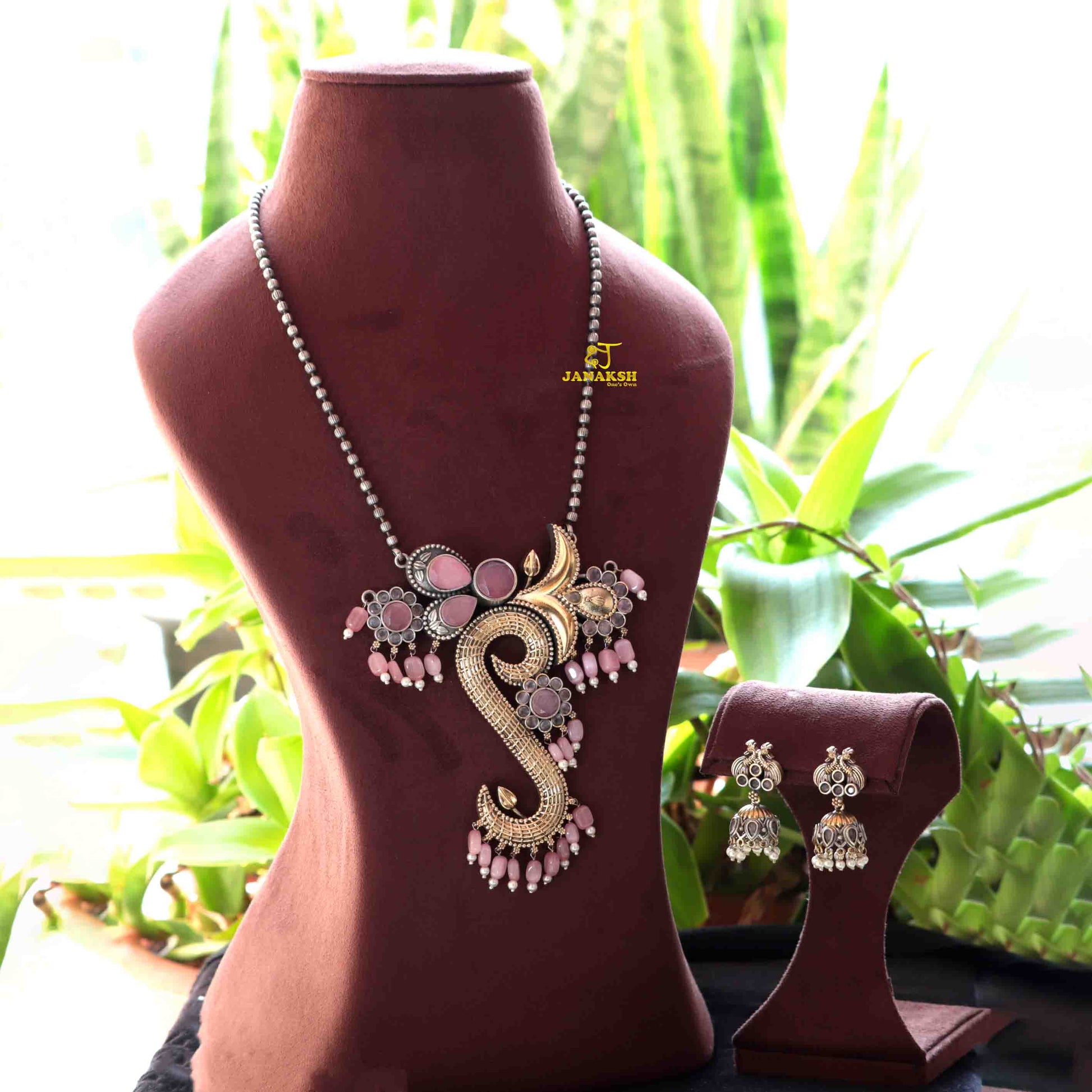 Elevate your style with our exquisite dual-tone pendant, a masterpiece adorned with Monalisa stones and intricate Lorel work. Each Monalisa tumble adds a touch of mystery and allure, perfectly complemented by an oxidized silver polish chain. Embrace timeless elegance with this captivating piece that seamlessly blends tradition with modern charm.