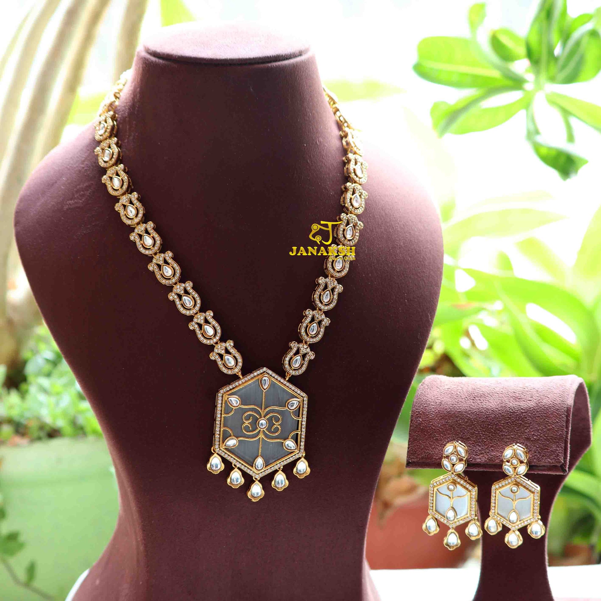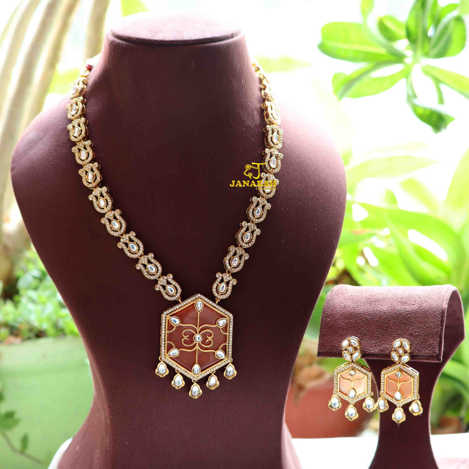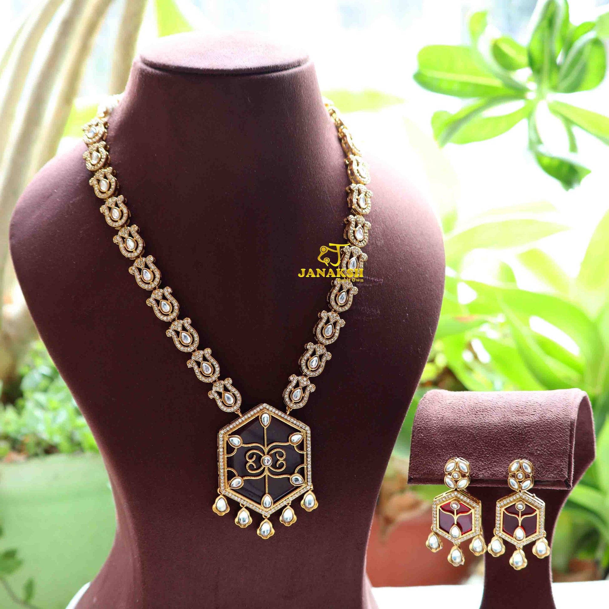Elevate your style with this exquisite long necklace, featuring a stunning combination of Polki Kundan and Monalisa stones set in a pendant with intricate filigree work. Accentuated with AAA quality CZ stones, this piece embodies timeless beauty and sophistication, perfect for any occasion.