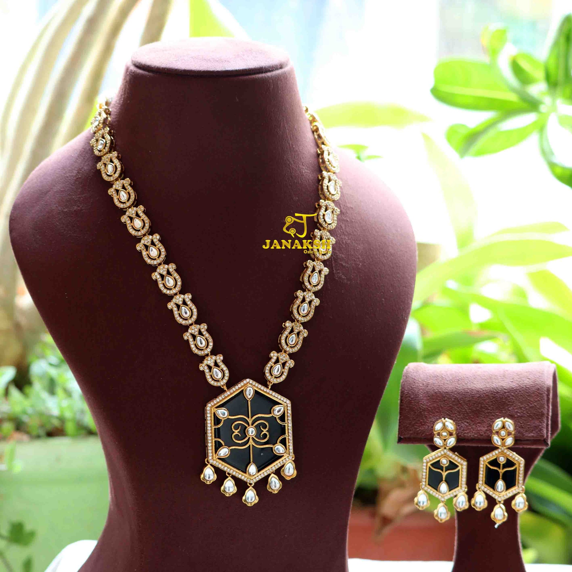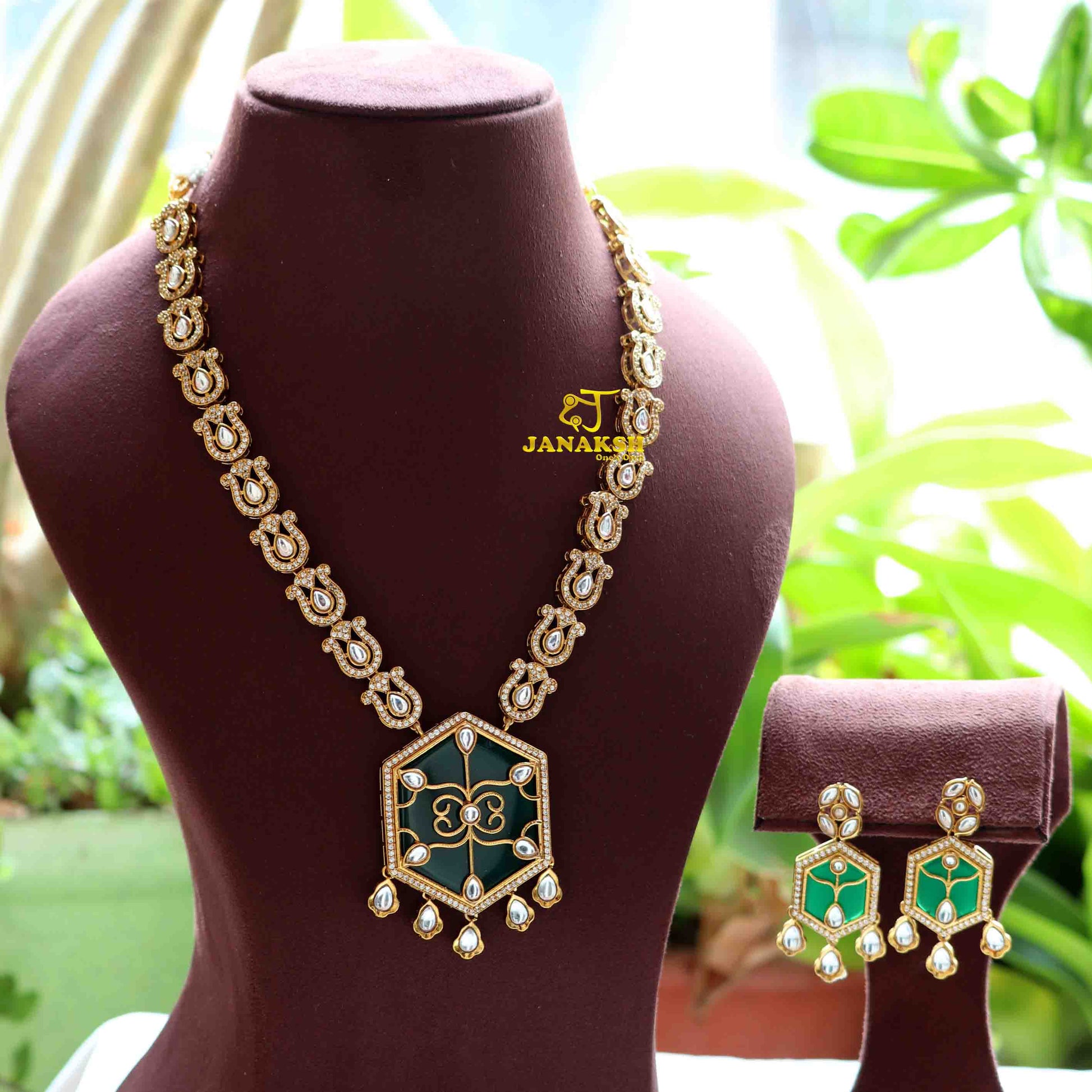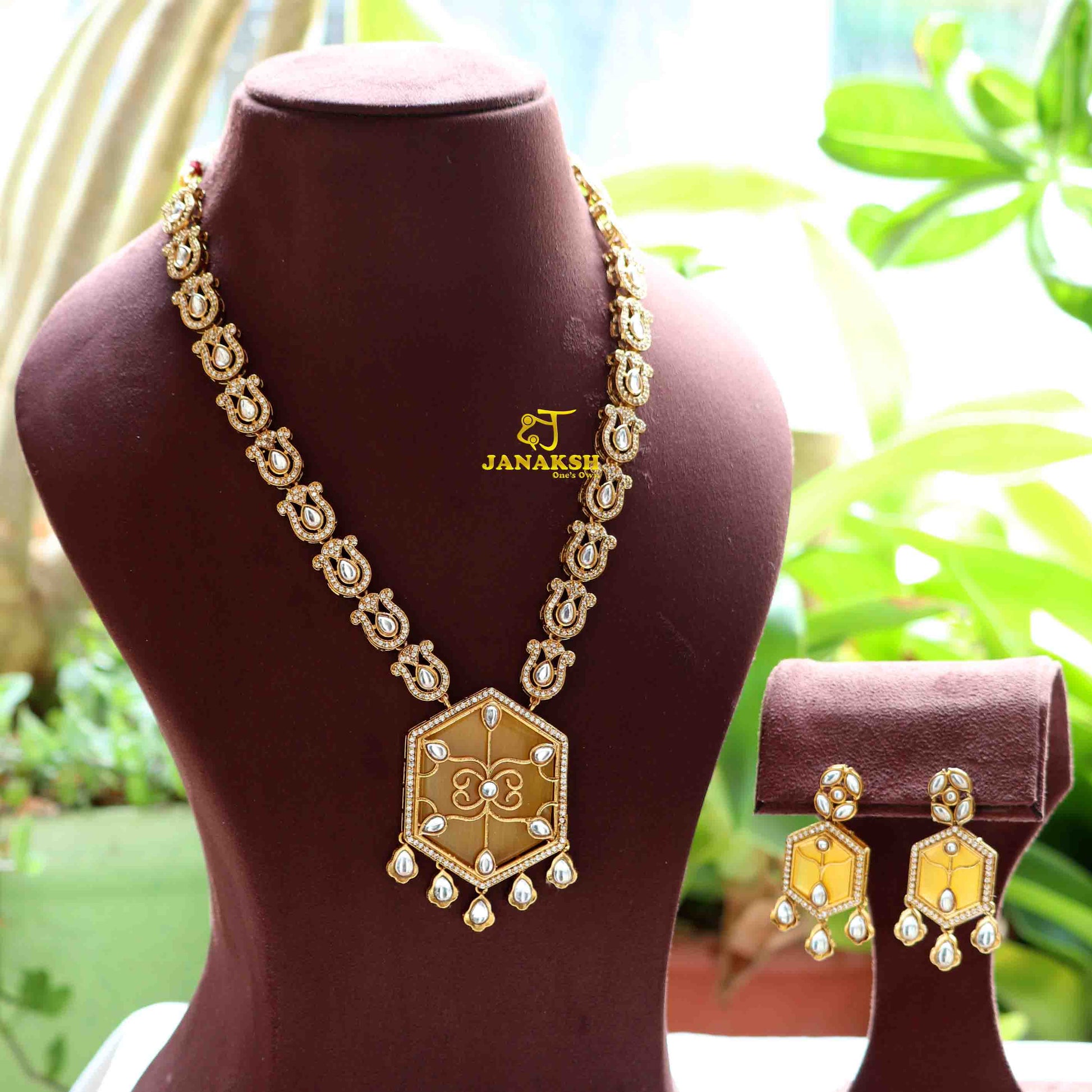 Elevate your style with this exquisite long necklace, featuring a stunning combination of Polki Kundan and Monalisa stones set in a pendant with intricate filigree work. Accentuated with AAA quality CZ stones, this piece embodies timeless beauty and sophistication, perfect for any occasion.